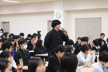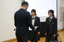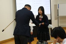 午後は第68回石川県高等学校放送作品コンクール表彰式と作品鑑賞が行われました。この表彰式はこれまで新人大会前に行われ,受賞校のみが参加するという形でのものでしたが,今回初めて多くの放送部員といっしょに行うという形になりました。北陸放送アナウンサーの久々江龍飛さんの進行で,北陸放送営業部長兼開発事業部長の今寺一義さんから表彰状を授与していただきました。アナウンス・朗読と同様,北信越大会が石川県開催ということで,オーディオメッセージ部門とビデオメッセージ部門の出場枠が増えており,多くの学校が出場することになりました。また,表彰式後には,各部門の番組を鑑賞し,改善点などを話し合う意見交換も行われました。活発な意見交換となり,とても実のある機会となりました。北信越大会に向けて高めあっていきましょう!