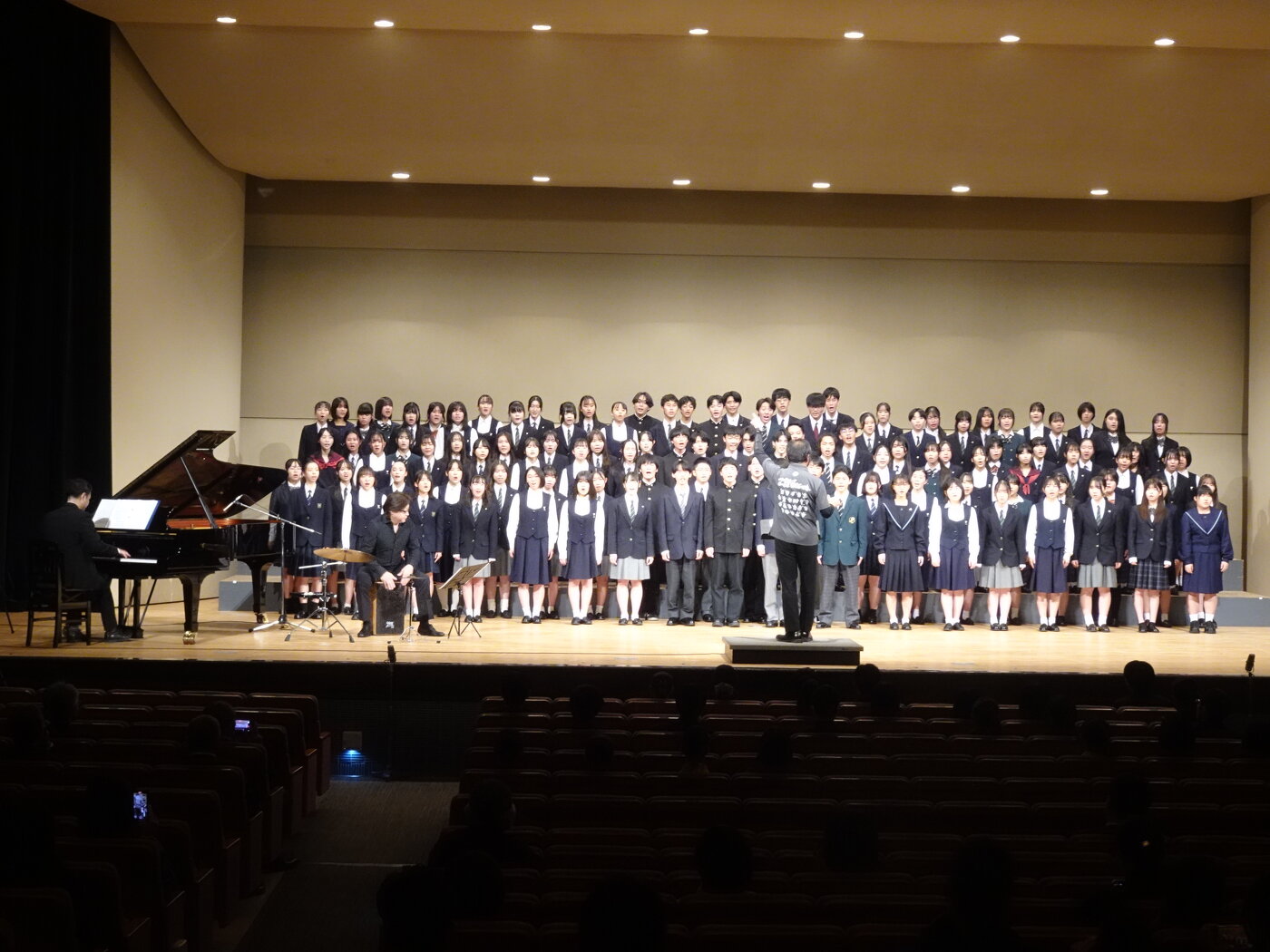 昨年度に引き続き第2回目となる石川県高等学校総合文化祭総合ステージに参加しました。昨日までの秋季合唱講習会で練習した成果を披露しました。ツナヨシさん編曲の「春の歌」「夏になって歌え」と松本俊明さん作詞作曲の「Noto」の3曲を歌い上げ、総合ステージを締めくくりました。普段は別々の学校で活動している10校の合唱部ですが、全員で一つになって歌い上げる経験は今後の活動により良い影響を与えてくれると思います。来年度は全国総文プレ大会になるのでさらに多くの学校が参加してくれることを願ってます。