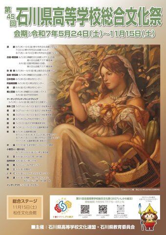 主会期 令和7年5月24日~11月15日 総合ステージ 11月15日 白山市松任文化会館ピーノ 石川県高等学校文化連盟の25専門部が、コンクールや競技会を行うとともに、作品展示や研修・交流を深める「石川県高等学校総合文化祭」を行っています。11月には総合ステージを実施します。各専門部のステージ発表や作品展示を行い、保護者や地域の皆様に高校生の芸術文化活動をアピールします。