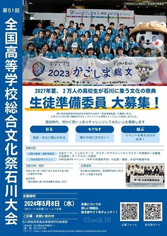 令和9年夏に実施する全国高等学校総合文化祭石川大会に向けた公募の第一弾として、大会テーマと今年度生徒準備委員を募集しています。詳しくは、総文祭サイトをチェックしてください! 受付を終了しました。ご応募ありがとうございました。