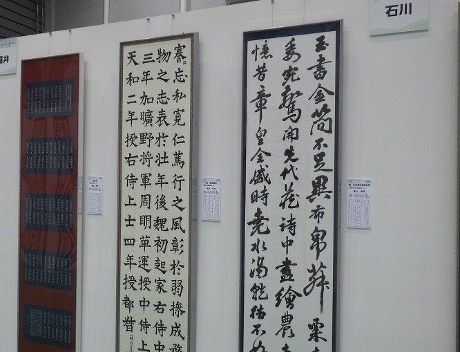 3校(左から順に日本航空高校石川、県立七尾高等学校、県立金沢泉丘高等学校)の生徒作品が展示されました。